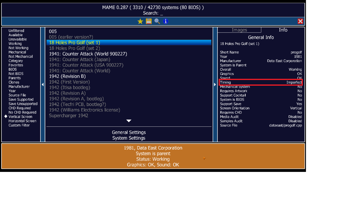 Hi When comparing MAMEUI64 0.287.0 versus MAME 0.287, the color status of some machines is different. Some screenshots of machines: - "progolf": this machine is orange in vanilla MAME because of imperfect timing. MAMEUI says it's green... - "39in1": here MAMEUI and vanilla MAME are both orange since MAMEUI correctly detects the sound is imperfect I hope it will be fixed in the next version.