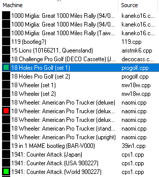 I also have no idea what you are talking about since the IC chip icons don't have any color depending on the status... Screenshot below to indicate the IC chip icons without colors vs. the icons that used to ship with MAMEUI which show the colors. If you don't have the Icons folder, you will never see any green icons (see 18 holes pro golf and 1941) I also opened a new thread for a bug in MAMEUI: the status of 18 holes pro golf is orange and not green in vanilla MAME, so MAMEUI tells another status. -