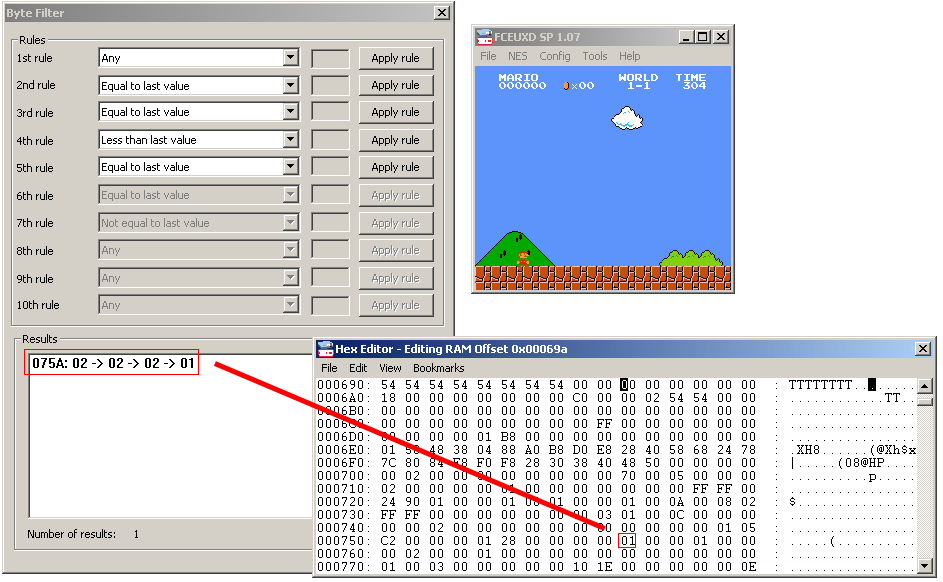 Here's another example. Suppose we want to find out where the number of player lives left are stored in Super Mario Bros. Check this screenshot to see the results
